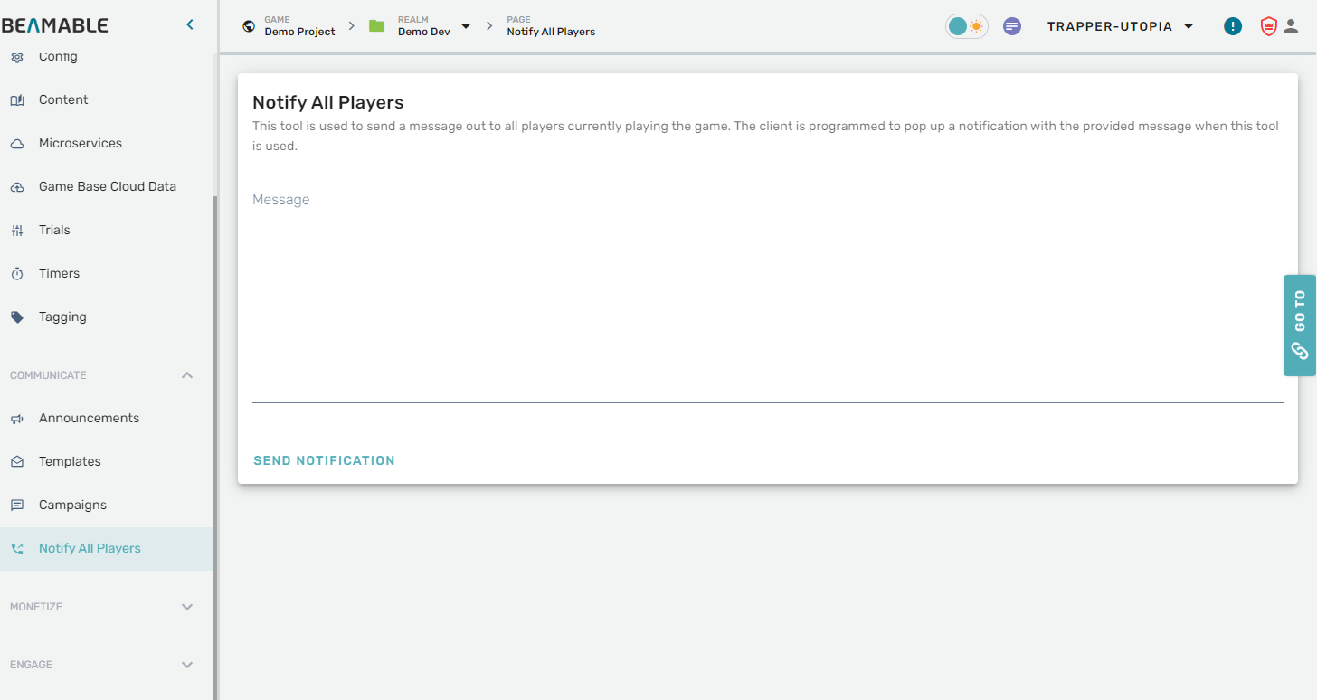 To access the Notify All Players feature, navigate to the Communicate section and select "Notify All Players"