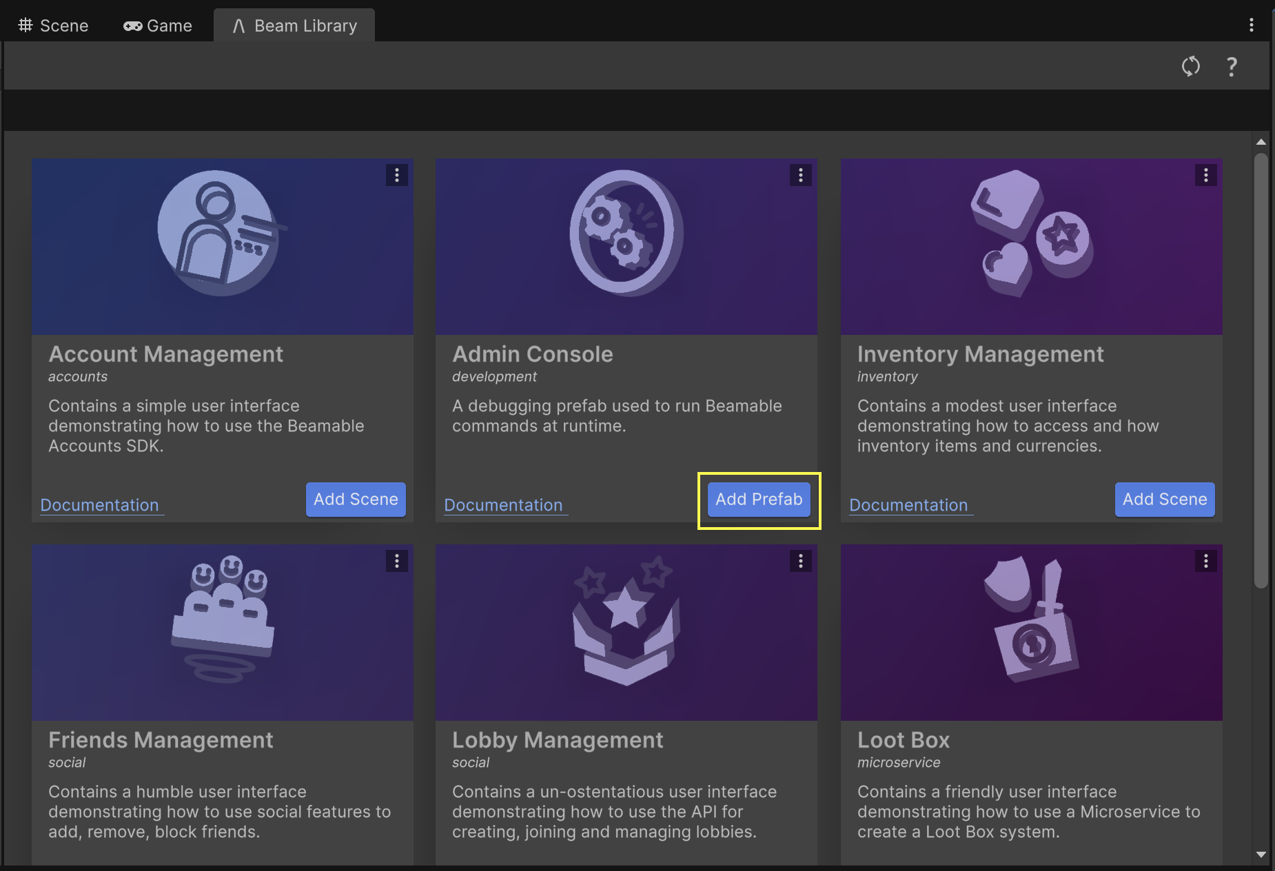In the Beam Library, find the Admin Console card and click the Add Prefab button to add the prefab to an empty scene.