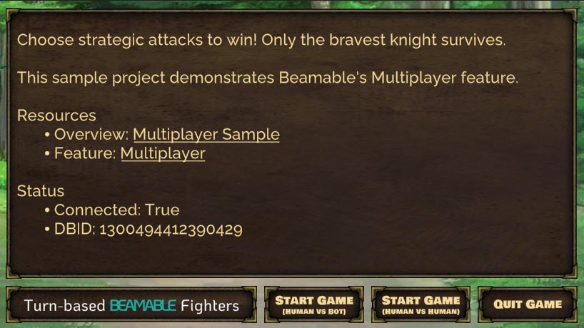1. Download the Multiplayer TBF Sample Project 2. Open in Unity Editor (Version 2021.3 or later) 3. Open the Beamable Toolbox 4. Sign-In / Register To Beamable. See Getting Started for more info 5. Open the 1.Intro Scene 6. Play The Scene: Unity → Edit → Play 7. Click "Start Game: Human vs Bot" for an easy start. Or do a standalone build of the game and run the build. Then run the Unity Editor. In both running games, choose "Start Game: Human vs Human" to play against yourself 8. Enjoy!