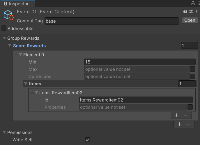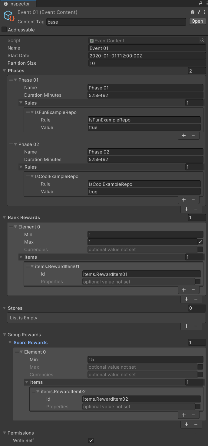 | "idle_content" | < some content id > | Create custom client logic to parse the name and value. Require that players meet this rule. Example: Limit which players may enter the Event or limit which players may claim rewards |