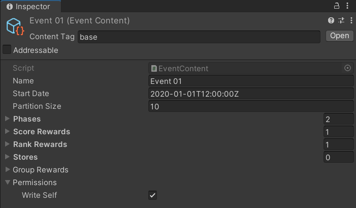 | 3. Select the "Event" asset | • Click the asset in the Content Manager Window • View the asset in the Unity Inspector Window |