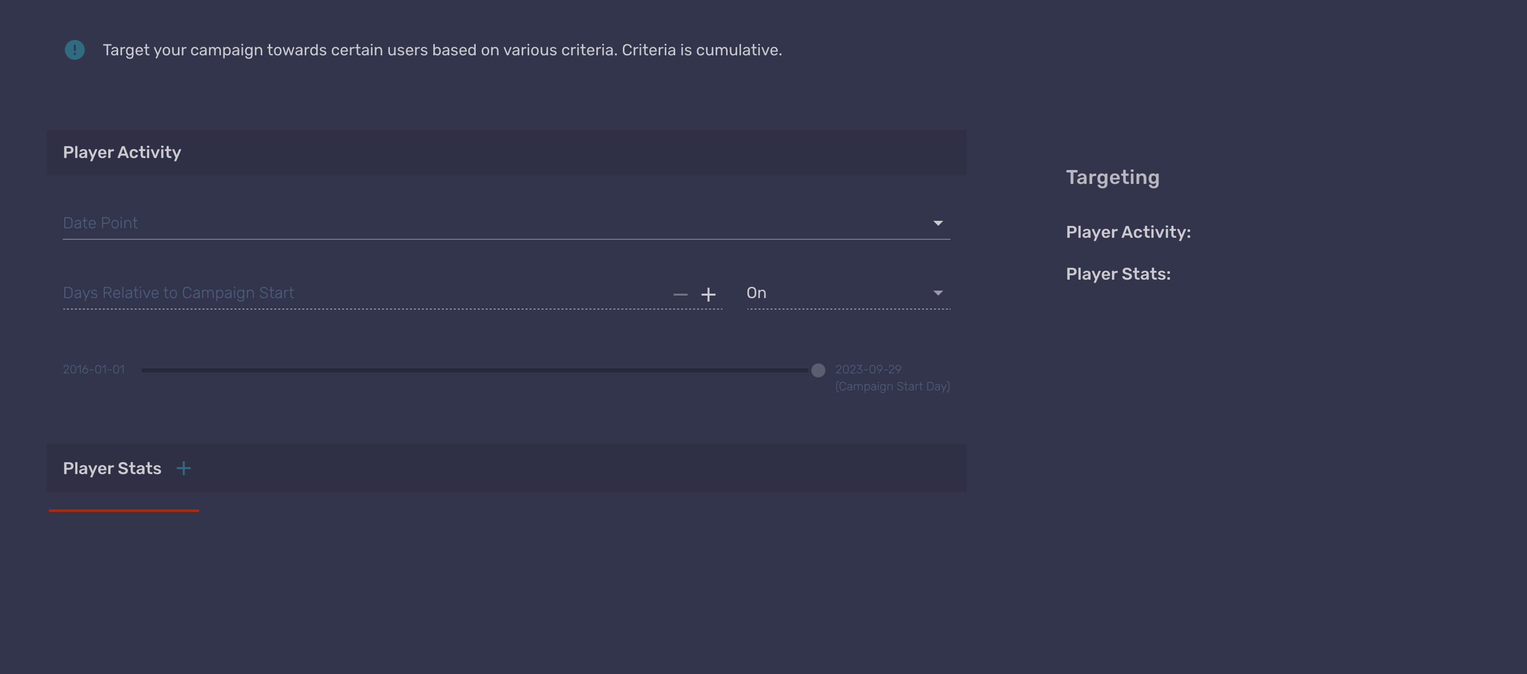 You can use Player Stats to define which players are going to receive a campaign. That can be done while creating a new campaign in the portal. In the following image you can see the stage in which this can be done.