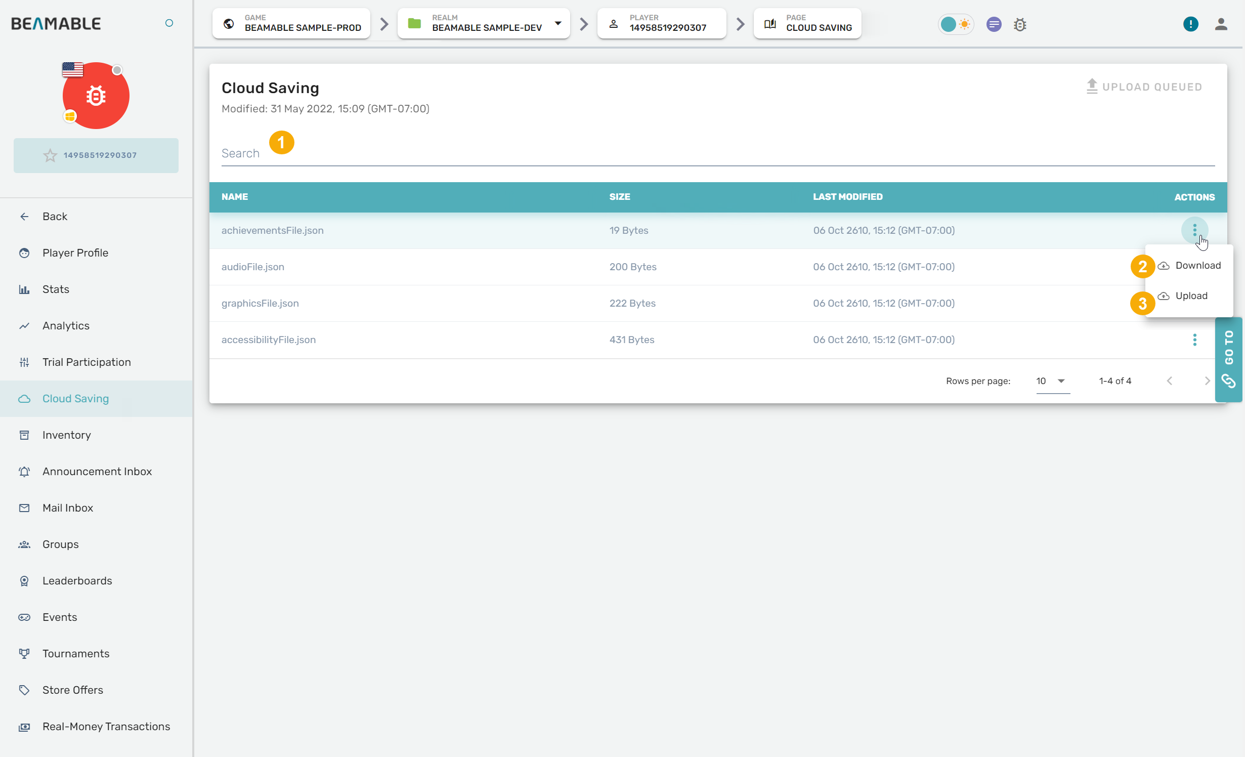 | 3. Upload | Replace an object of player data with a file that has the same name. |