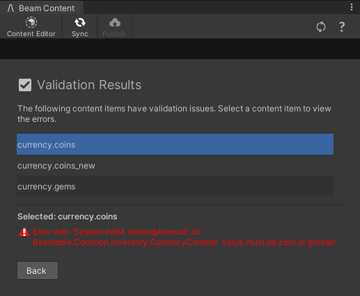 Beamable provides built-in validation and also allows for custom validation. Content Validation Results: