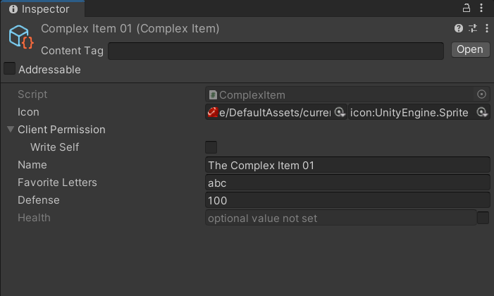 While each content object inherits from Unity's ScriptableObject, these objects exist solely in memory for Unity Editor inspection and are not saved to disk.