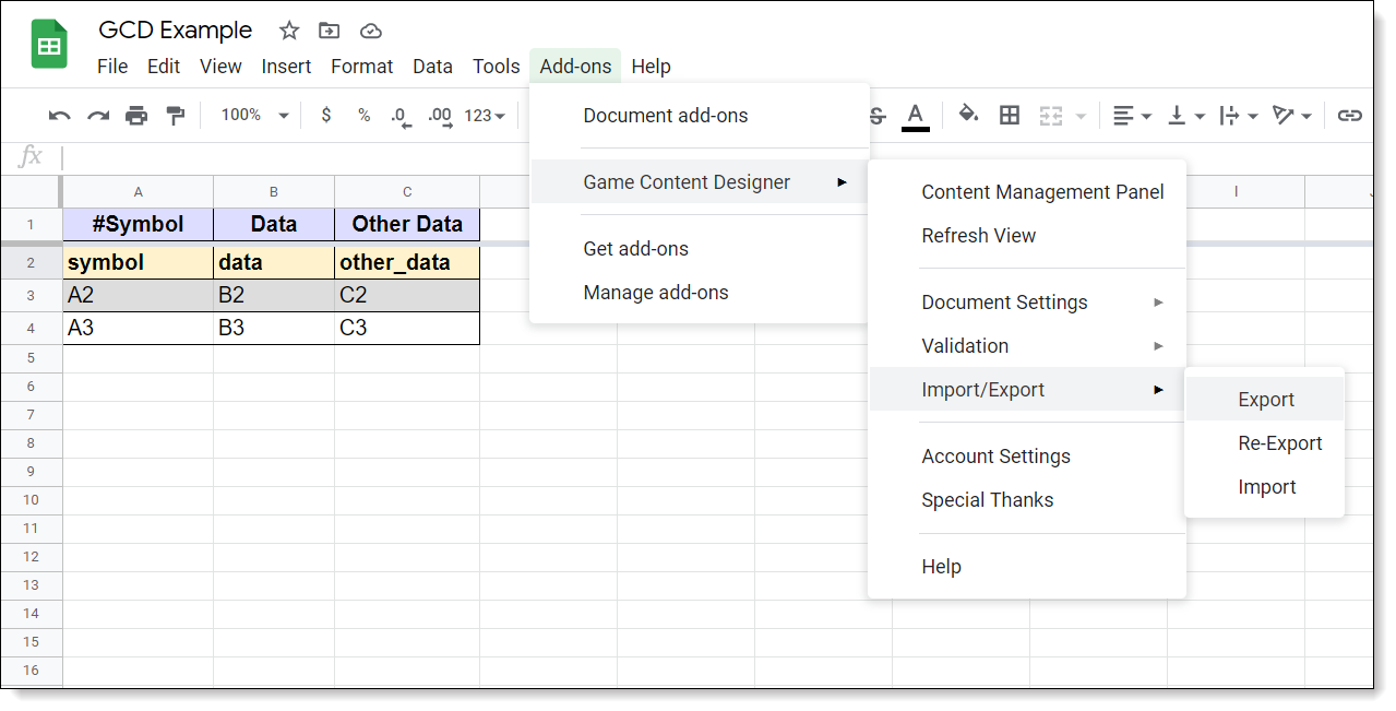 GCD must be installed in the game maker's active Google account to be added to a new Google Sheet.