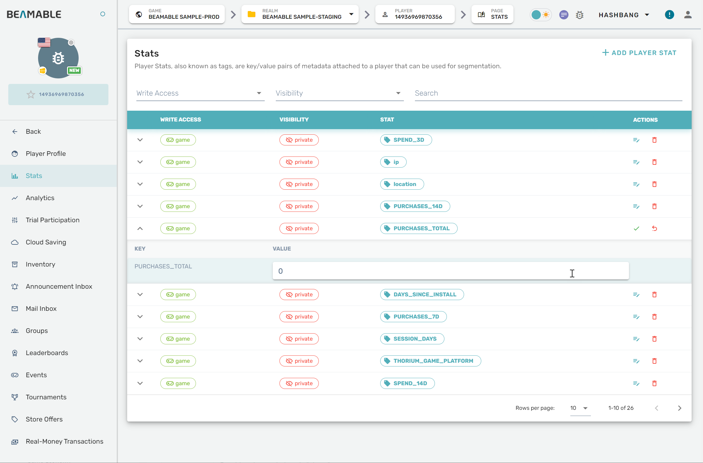 The Beamable Portal allows you to view and edit player stats directly through the web interface: