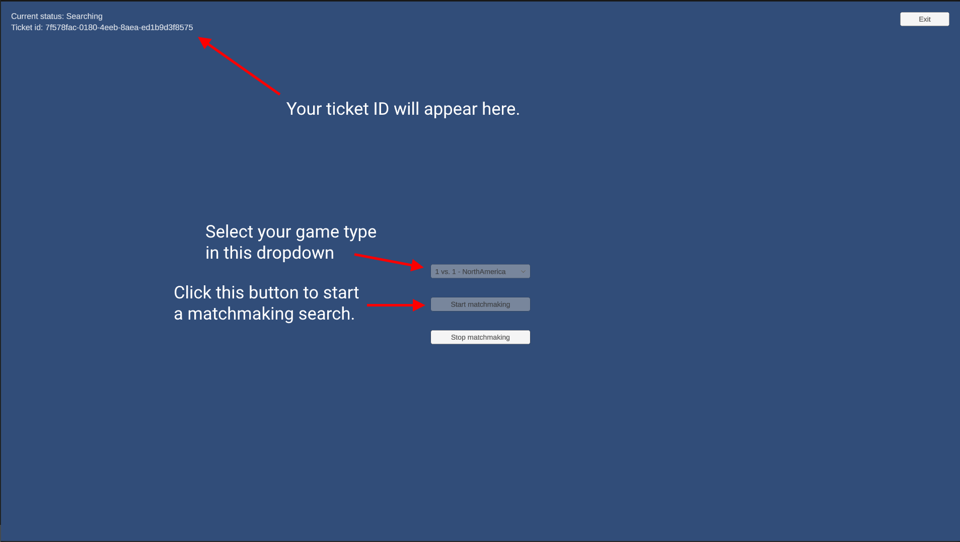 Once you have 2 games running, select the same game type on both instances and click the Start Matchmaking button and they will be matched. To validate the game type filtering, change the game type on one of the machines. This will create a mismatch, then start matchmaking again and observe that the two players are not matched up.