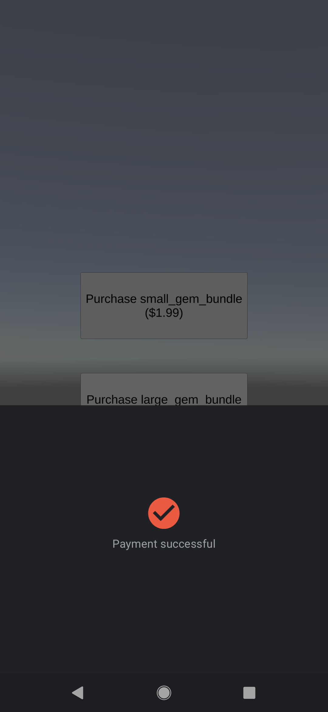 This project can be run in either the Unity editor, or built to an Android device and tested there. Simply press one of the two buttons to initiate a purchase.