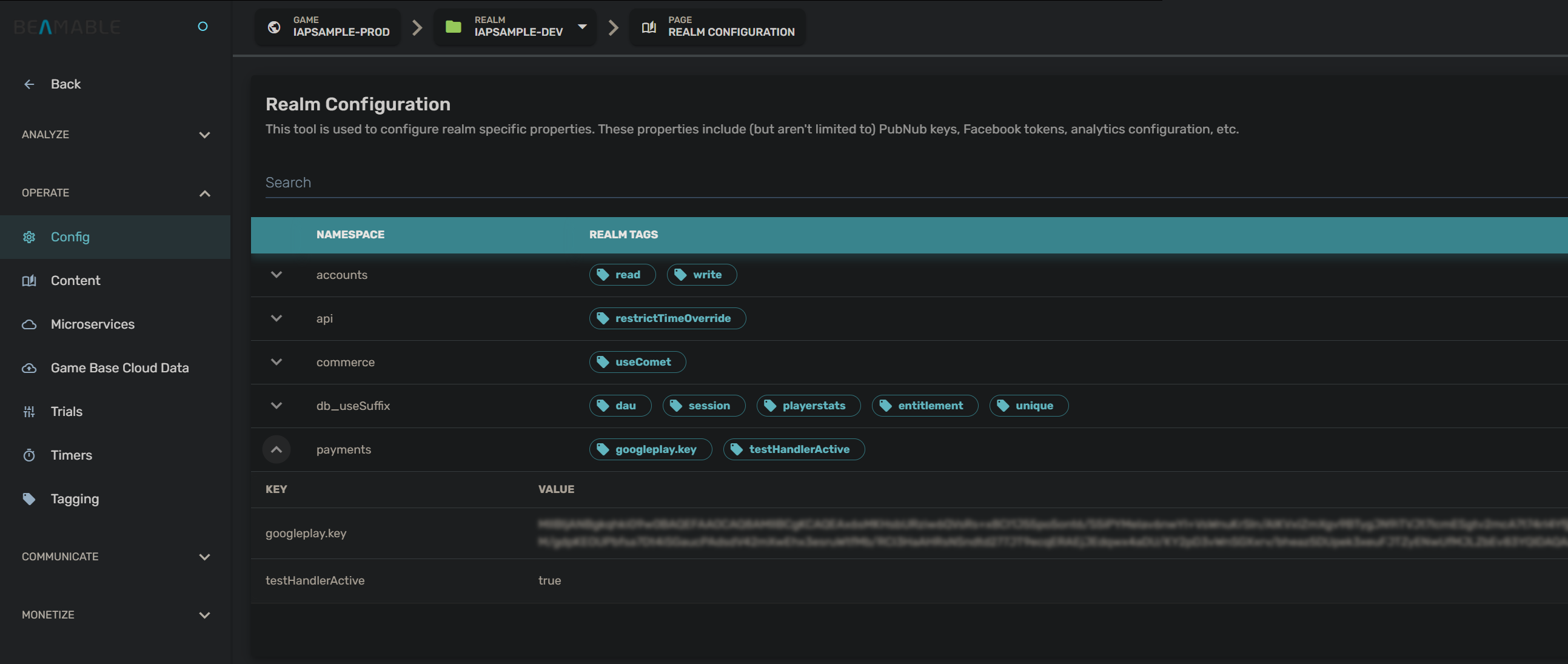Finally, add your license key to your realm configuration. Under the payments namespace, create a new key called googleplay.key, with the value being your license key.