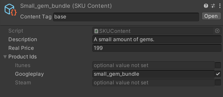 Back in Unity, we'll need to set up a store and create listings for the purchasable items. Unlike items that are purchased with virtual currency, real money items use SKUs as the price for the listing. Otherwise, the setup is mostly identical. For more info on virtual currency purchases or basic store setup, see Stores - Guide.