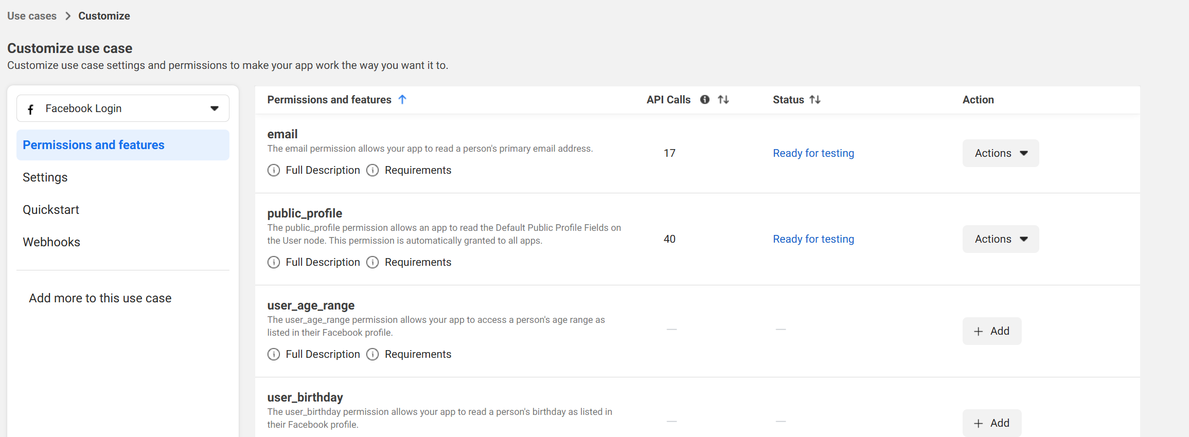 - Since we are using email you need to add its permissions: Dashboard / Use Cases / Customize the `Authenticate and request data from users with Facebook Login / Permissions and Features => add email