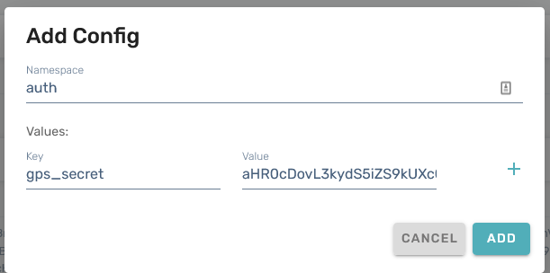- Go to the Portal → Operate → Config and press Add Config and add config with namespace auth, key gps_secret, and value that is encoded to base64 content of client_secret.json.