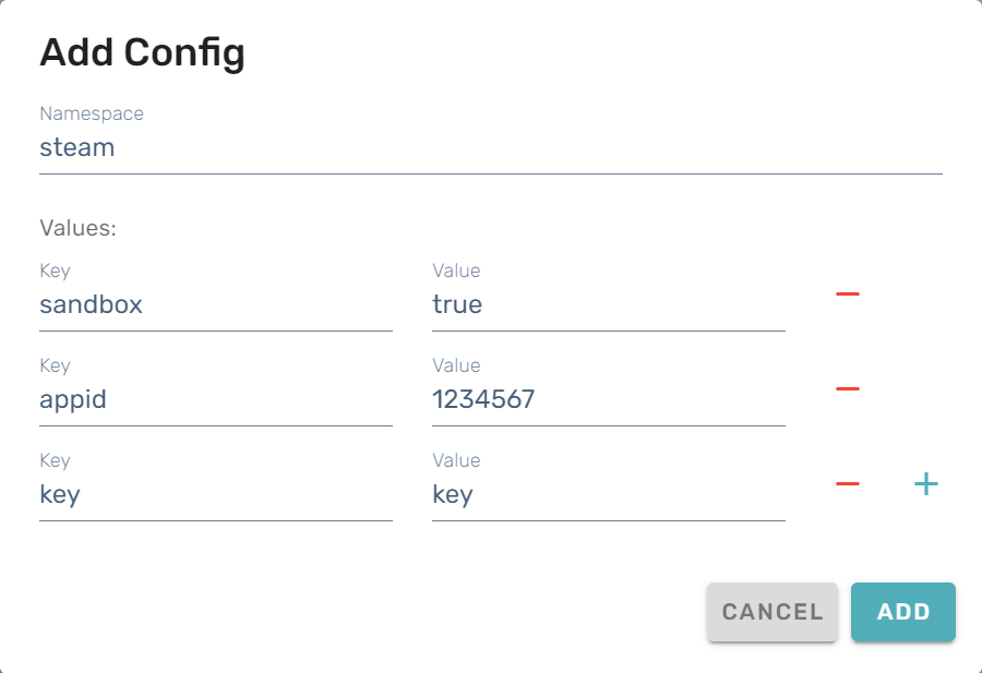| 3 | Create a new Key in the configuration by clicking on +Config and name it "steam" (all lower-case) in the namespace field |