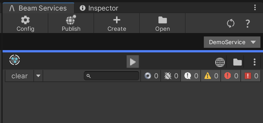 Finally, the main content of the Beam Window is the log view for the Microservice. The logs from locally running Microservices will be sent to this section. There are log level filters similar to the Unity Console logs. However, this window has additional log levels, including Verbose, Debug, and Fatal. By default, Verbose and Debug are disabled, because they can be overly noisy when looking at your service logs. However, they can be helpful to debug a broken Microservice.