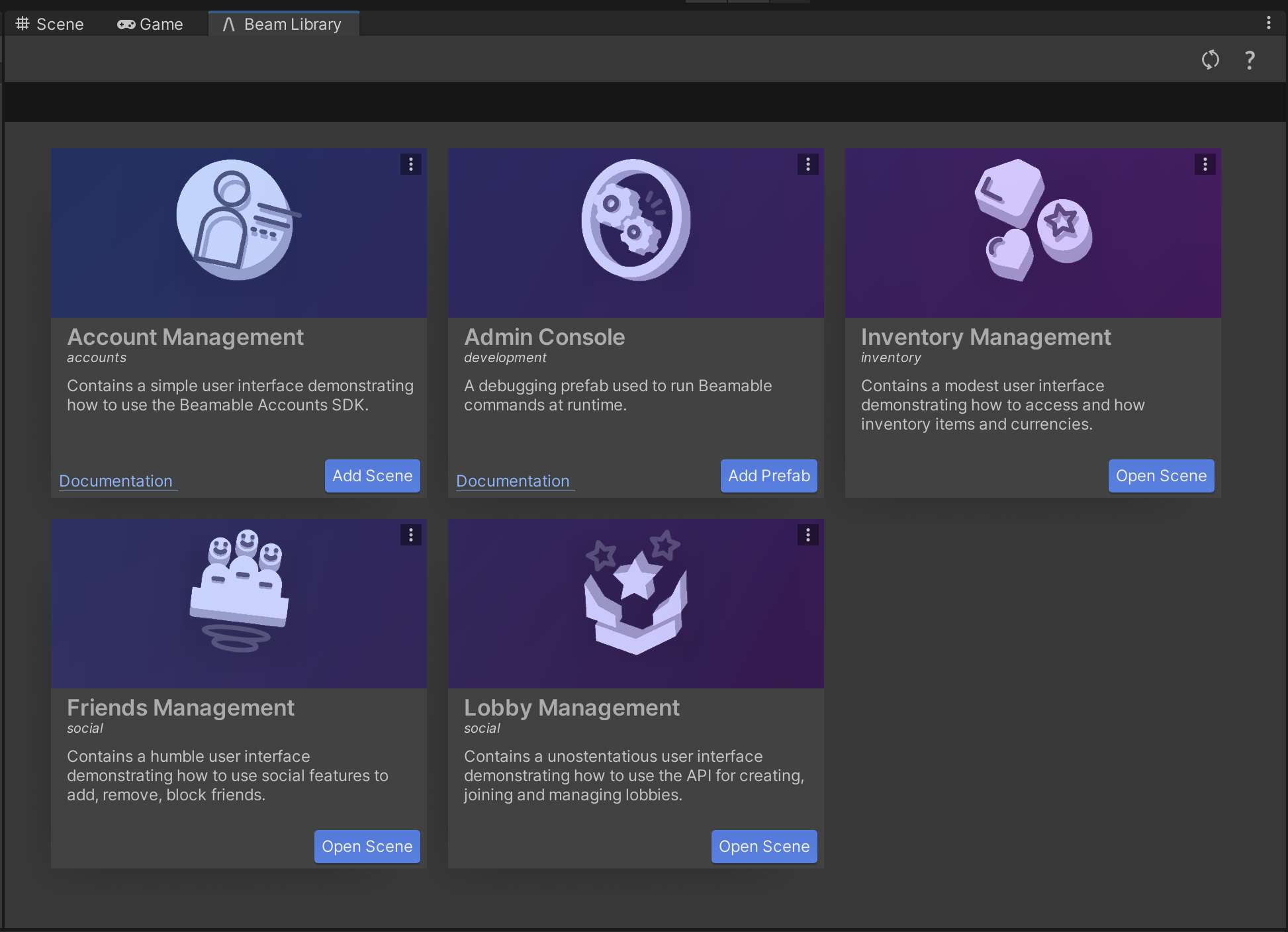 The Beam Library is a collection of package samples and prefabs to help get you started learning the Unity SDK. To open the Beam Library, click on the Beamable Button (at the top-right of the Unity window), and select Beam Library.