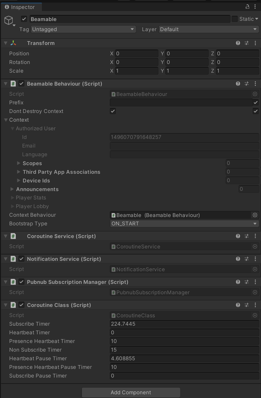 When a BeamContext instance is initialized, a GameObject will be instantiated under Unity's "DontDestroyOnLoad" folder in the scene hierarchy. This GameObject will be named "Beamable" and contains information and behaviours for the currently running context, including: