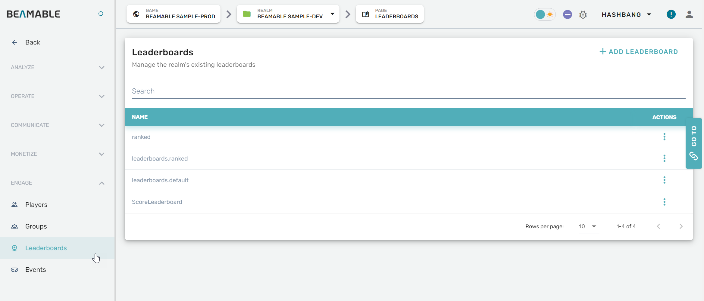 The leaderboards management interface allows you to view and configure leaderboard settings:
