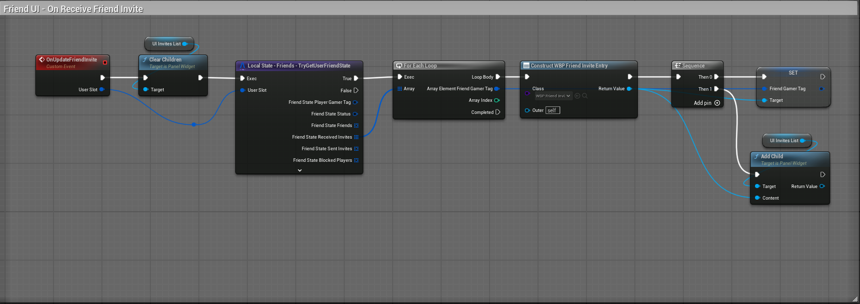 In the example below, we demonstrate how to retrieve the user's friend state and use it to update a view or another screen. In this case, the example simply sets a list of all invites in the friend state. There are other ways to handle this, such as adding or removing items based on events, rather than setting the entire list. For simplicity, we're showing this approach.