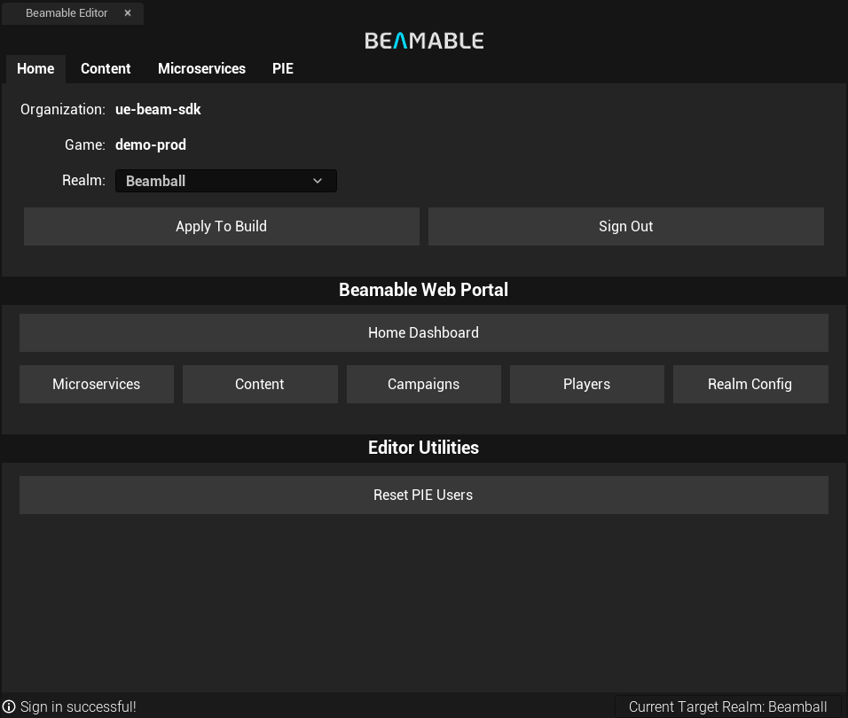 In the same section, you can also find the Home Dashboard button, which will open the Beamable Portal in your web browser, allowing you to manage your project settings and resources online. There's also other shortcuts to the Portal specific sections, such as the Microservices and Content.