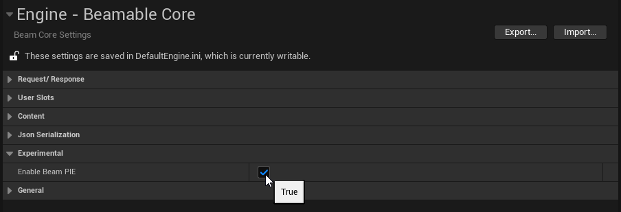 PIE Settings are currently marked as Experimental under Project Settings > Engine > Beamable Core and are disabled by default.
