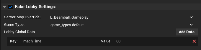 When Fake Lobbies are enabled, the Add Lobby Data will be available to add custom Key-Value pairs that will be used to initialize the per-player key-value store lobby itself. This data is accessible in the Gameplay Level and can be used to simulate various scenarios such as the selection of which skin the player chose or many other parameters that would get put into the lobby either via Federation or Matchmaking/Lobby systems themselves.