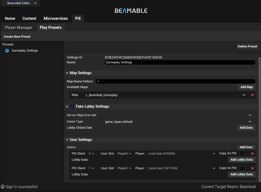 Play Presets can be configured to initialize lobbies for PIE, allowing you to test multiplayer scenarios with real Beamable accounts directly in PIE from the Gameplay Level. This is especially useful when testing games that use the Gameplay Level as the entry point, since it ensures the initialization of Beamable systems and lobby setup. Normally, this initialization would occur in earlier Levels, such as the Main Boot Level (Main Menu/Title Screen/etc...).