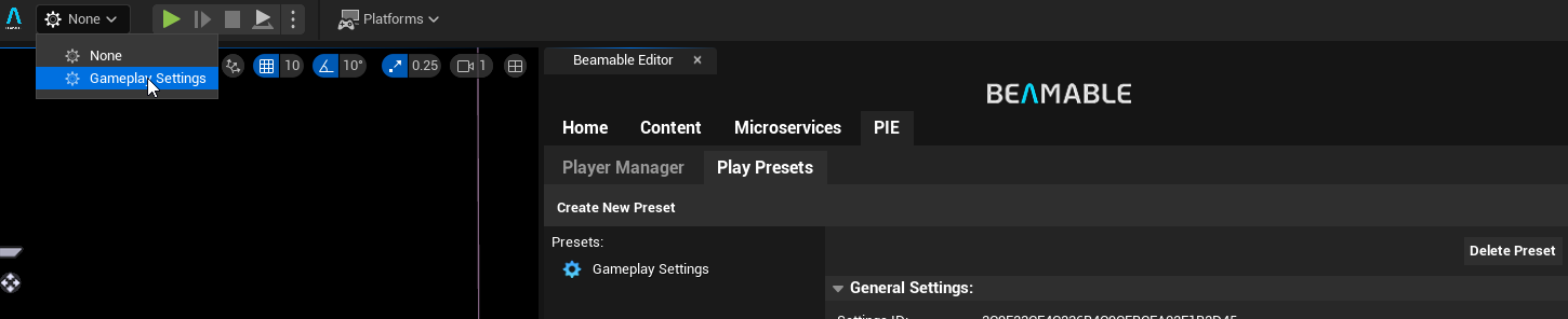 To enable them, go to the Beamable Core section in the Unreal Engine editor settings. Once enabled, restart the editor and the PIE Settings UI will be available.
