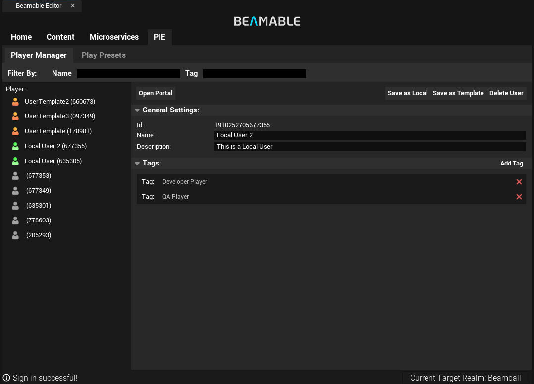 Whenever you run the game in the editor with PIE, the Player Manager records any logged-in players. This creates a new profile in the list, which can be inspected using the Open Portal button.