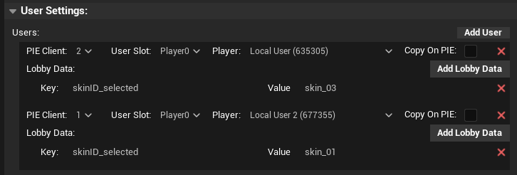 Number of Playersyou define in Unreal's own Play Mode Settings. - User Slot: For each PIE client, you can define a user for each of configured